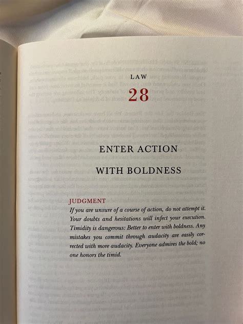 • Law 28: Enter Action with Boldness. When you enter a situation, do it with confidence. Hesitation breeds doubt. It’s like going on stage. If you walk on hesitantly, the audience won’t be convinced. Boldness gets people’s attention, and it can help you get what you want.