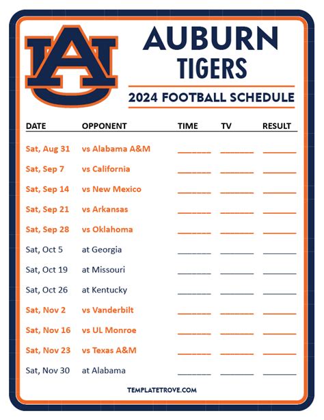 So, what are you waiting for? Start searching for your printable Auburn football schedule today and get ready to cheer on the Tigers to victory! War Eagle!