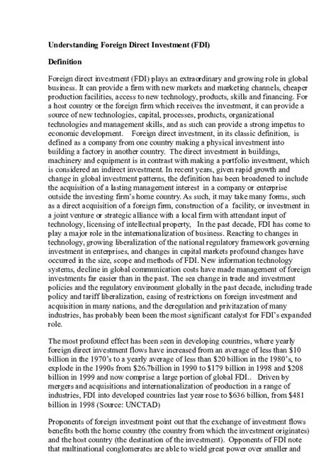 Now, why should you even care about Foreign Direct Investment ? Well, FDI plays a crucial role in the global economy. For the country receiving the investment, FDI can bring in much-needed capital, boost economic growth, create jobs, and introduce new technologies and management practices. Imagine a developing country that needs to upgrade its infrastructure. An FDI project could fund the construction of new roads, bridges, or power plants, leading to better connectivity and improved living standards. Moreover, FDI often leads to the transfer of knowledge and skills, as foreign companies train local workers and share their expertise. This can help to build a more skilled workforce, increase productivity, and foster innovation. From the investor’s perspective, FDI can offer access to new markets, lower production costs, and diversification of business risks. For example, a company might invest in a foreign country to take advantage of lower labor costs or to gain access to a large and growing consumer market. FDI can also provide a way to circumvent trade barriers, such as tariffs and quotas, by producing goods locally rather than exporting them. However, it’s not all sunshine and roses. FDI can also raise concerns about exploitation of resources, environmental degradation, and the impact on local businesses. It’s essential for governments to have policies in place to ensure that FDI benefits both the investors and the host country, promoting sustainable and inclusive growth. In essence, FDI is a powerful engine for economic development, but it needs to be managed carefully to maximize its benefits and minimize its potential risks.