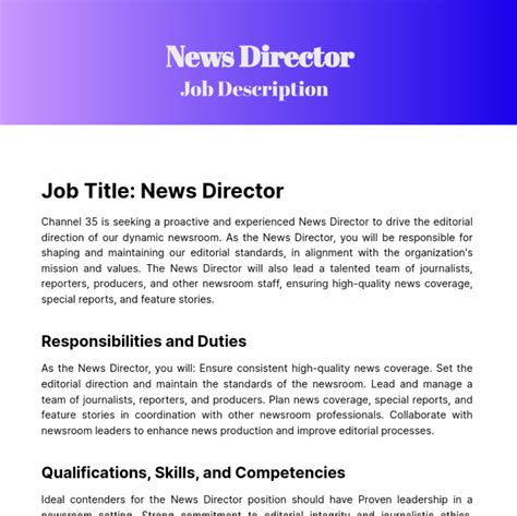 - Advancing Your Career: With experience and hard work, Evening News Directors can advance to higher-level positions in the television industry.