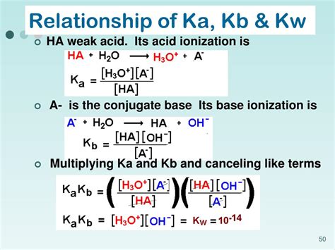 The Kb for ammonia is approximately 1.8 x 10^-5. Just like with Ka, we often use pKb , which is the negative logarithm (base 10) of Kb: pKb = -log10(Kb). A lower pKb value means a higher Kb value and thus a stronger base. The relationship between Ka and Kb is also really important. For a conjugate acid-base pair (like HA and A-, or BH+ and B), there’s a direct relationship: Ka * Kb = Kw, where Kw is the ion product of water, which is 1.0 x 10^-14 at 25°C. Taking the negative logarithm of both sides gives us: pKa + pKb = 14 (at 25°C). This means if you know the Ka of an acid, you can figure out the Kb of its conjugate base, and vice versa. This relationship is a cornerstone of acid-base calculations and helps us connect the strengths of acids and their corresponding bases. So, whether it’s Ka for acids or Kb for bases, these constants give us a quantitative measure of their strength, allowing for accurate predictions in chemical systems.