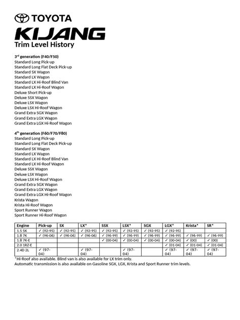 • The Kijang Pick-Up: A commercial variant designed for transporting goods. This model was specifically tailored for businesses and entrepreneurs who needed a reliable and affordable vehicle for transporting goods. Its sturdy construction and ample cargo space made it an ideal choice for a wide range of commercial applications. The Kijang Pick-Up was designed to withstand the rigors of daily use, ensuring its durability and longevity. Its practicality and affordability made it a popular choice among small business owners and contributed to the Kijang’s overall success.