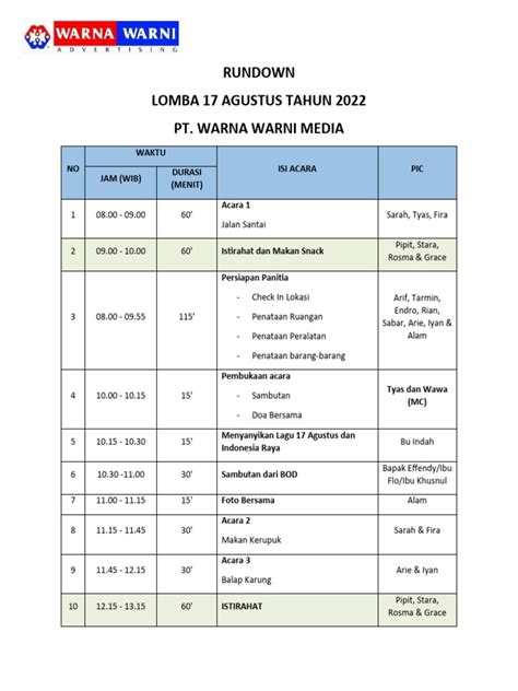 • Organization is Key: A rundown helps you organize all the activities in a logical order. This means no more jumping from the panjat pinang to the tarik tambang without a breather! Everything flows naturally, keeping the energy high and the attendees engaged.