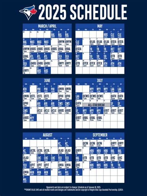 The Toronto Blue Jays 2025 schedule printable PDF is an essential tool for any dedicated fan. It offers convenience, clarity, and the ability to plan your season effectively. By knowing where to find the schedule, what to look for in a good format, and how to customize it, you’ll be well-prepared to cheer on the Blue Jays throughout the year. So, grab your printable schedule , mark your calendars, and get ready for another fantastic season of baseball! Let’s go Blue Jays!