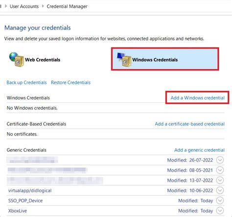 • Select Windows Credentials or Web Credentials: Depending on the type of resource you’re trying to access, you’ll find credentials listed under “Windows Credentials” or “Web Credentials.” Look for any entries related to the network resource you’re trying to access (e.g., a shared folder, a server name, or your domain).
